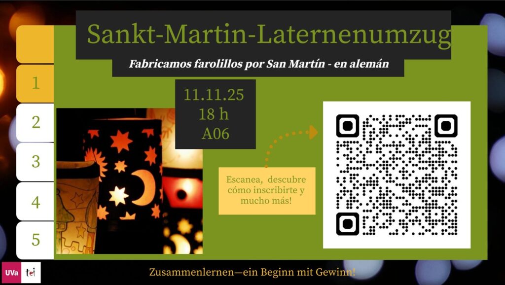 La comunidad Zusammenlernen – ein Beginn mit Gewinn («Aprender juntos – un inicio con beneficio») de nuestra facultad ha organizado una actividad cultural que tendrá lugar el próximo martes, 11 de noviembre, a las 18h en el aula A06. Vamos a fabricar farolillos por Sankt Martin (San Martín) y a cantar canciones típicas de esta tradición alemana. La inscripción y la preparación del vocabulario para la actividad están disponibles aquí: Sankt-Martin-Laternenumzug | Genially No es necesario aportar material adicional.